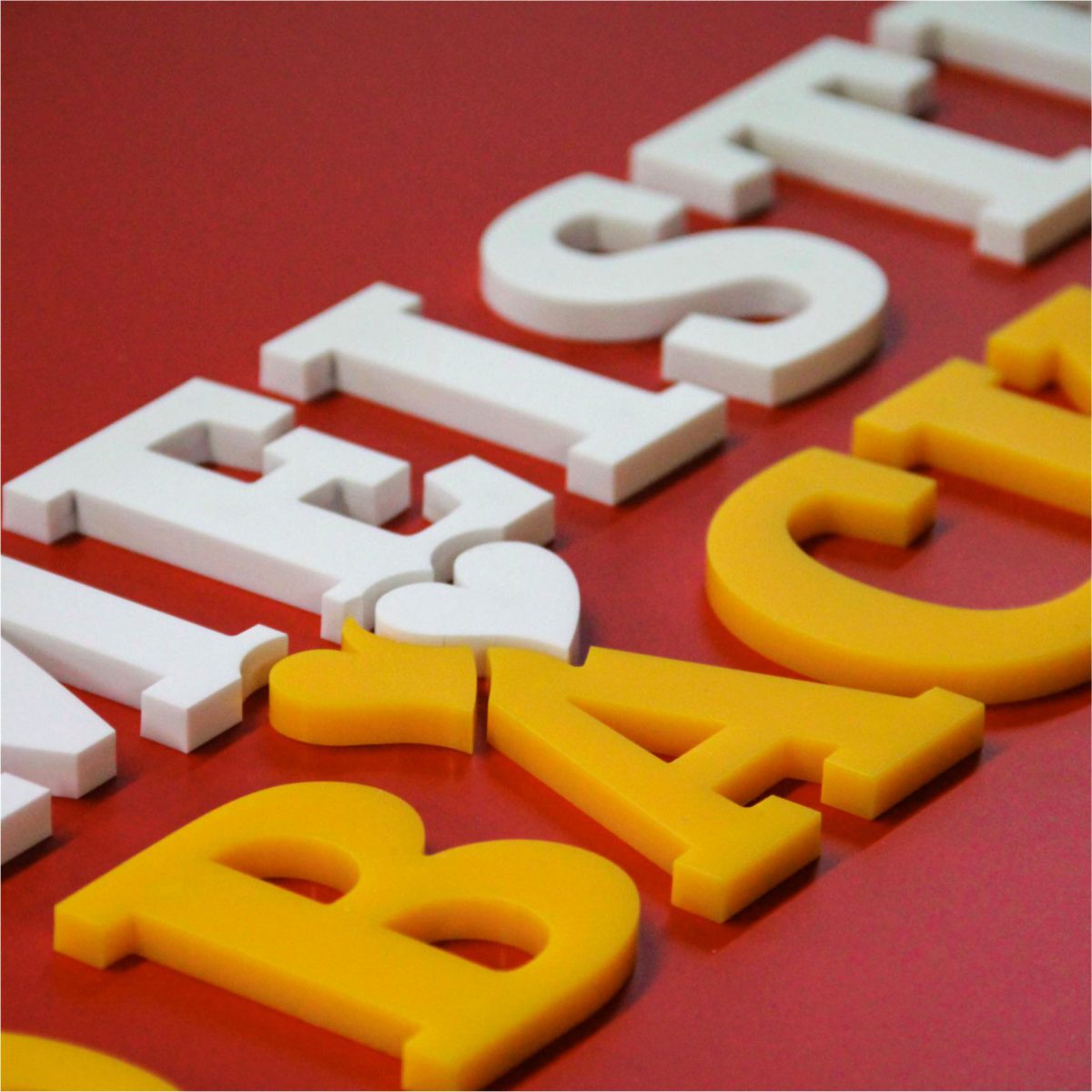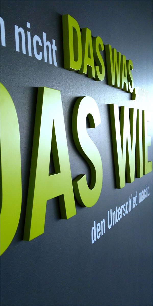 Diese Sparte der Werbetechnik verleiht Räumen oder Außenwänden ein außergewöhnliches Design. Die Materialauswahl ist nahezu unendlich vielfältig: Acrylglas einschichtig oder in mehreren Schichten verklebt, Aluminium mit oder ohne Lackierung, Kupfer, Messing, Edelstahl, Holz, Hart-PVC-Platten massiv oder geschäumt sowie ein Material-Mix aus diesen Rohstoffen ist möglich. Für besonders leichte, aber sehr empfindliche Messestand-Beschriftungen fertigen wir auch Styropor-Buchstaben.